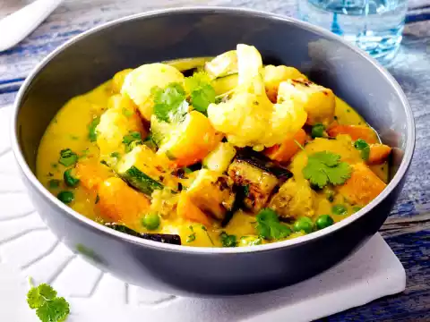 Heat the oil in a wide saucepan. Brown onion, potatoes, carrot and zucchini for about 5 minutes. Season everything with salt and pepper. Dust with 2 tablespoons curry and flour and sauté briefly. Deglaze with about 400 ml water and coconut milk. Bring to the boil, stir in broth. Add cauliflower and simmer covered for about 10 minutes, stirring gently once.