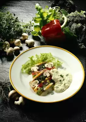 Pour in a thin layer of aspic stock and let it solidify in the refrigerator. Cover with slices of egg and red pepper. Then cover again with a thin layer of aspic and let it set. Now lay a layer of broccoli, mushrooms and corn.