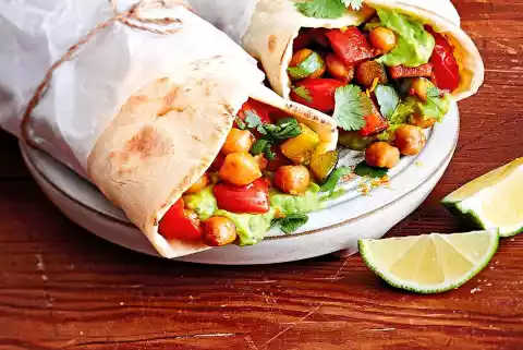 Spread breads with guacamole, spread vegetables on top, sprinkle with coriander and roll up into wraps. Wrap in wax paper as desired and tie up with thread.