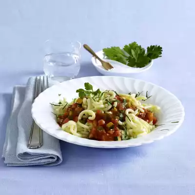Deglaze with 1/8 litre water, bring to the boil and add the tomatoes. Simmer sauce for 3-4 minutes and thicken with sauce thickener. Season sauce with salt, pepper and paprika. Drain the pasta and serve with the sauce.