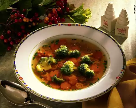 Clean the broccoli and divide into small florets. Peel and wash the carrots and cut out narrow wedges all around. Cut the carrots into thin slices. Cook pasta in boiling salted water for 8-10 minutes. Bring the broth to the boil and cook the broccoli for 5 minutes.