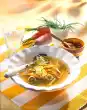 Add carrot slices and simmer for another 5 minutes. Wash the chives and cut into small rolls. Drain noodles and add to the soup. Season with salt, pepper and nut oil. Serve sprinkled with chives