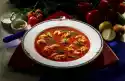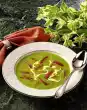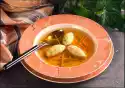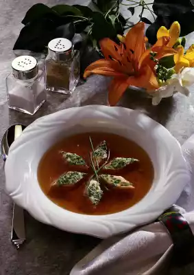 Place in a hot water bath and allow to set for 20-30 minutes. In the meantime heat up the stock. Turn over the egg and cut into lozenges. Arrange in 6 deep plates in the shape of a flower. Pour hot broth over them and serve garnished with chives.