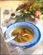 Season with salt. Cut the remaining soup vegetables into fine strips. Blanch in boiling salt water for about 1 minute. Rinse briefly in cold water, remove and drain. Turn over the egg and cut into small cubes. Sieve broth. Spread the vegetable strips and egg whites in soup bowls and fill up with the hot stock