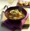 Peel and halve onions. Heat up a pan. Fry the onion halves with the cut surface facing down for about 10 minutes until dark brown. Clean the soup greens and cut them into small pieces, except for approx. 100 g for the vegetable garnish. Put the onions and 1 litre of water in a pot. Bring to the boil and simmer for about 1 hour. Season with salt. Cut the remaining soup vegetables into fine strips. Blanch in boiling salt water for about 1 minute. Rinse briefly in cold water, remove and drain.