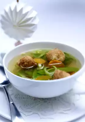 Cut the remaining carrot and leek into thin slices or rings. Wash and clean the mangetouts. Pour stock through a fine sieve into another pot. Bring to boil and cook the prepared vegetables for about 5 minutes. Season stock with salt. Serve the broth and the fried peas