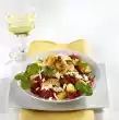Fry twelve small buffers in hot oil in a coated pan until golden brown. Wash the chives, dab dry and cut into small rolls. Mix quark, cream and chives. Season with salt and coloured pepper.