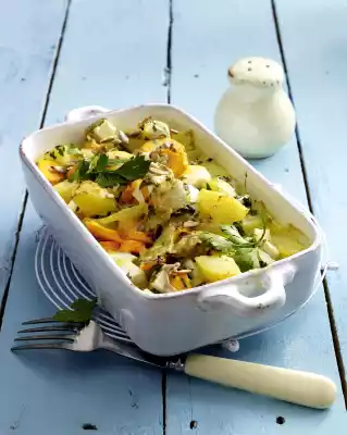 Drain the potatoes. Spread with carrots, kohlrabi and sunflower seeds in a greased Aufl tin. Pour sauce over it and spread the rest of the cheese on top. Bake in the preheated oven (electric cooker: 200 °C/ convection oven: 175 °C/gas: level 3) for about 30 minutes.