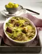 Peel, wash and cut the potatoes into thick slices. Clean, wash and cut the beans into pieces. Cook both in boiling salted water for about 15 minutes