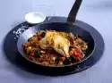 Put the ragout in an ovenproof dish. Cut out the puff pastry about 2 cm larger than the form. Cut out small moons from the remaining dough and decorate the dough cover with them. Place the dough cover on the baking dish and press down on the edges.