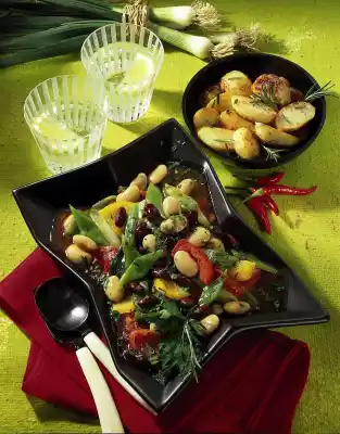 Clean, wash and chop the beans, peppers and spring onions. Cook in boiling salted water for 10 minutes, then drain. In the meantime, rinse and drain the kidney beans and bean seeds.