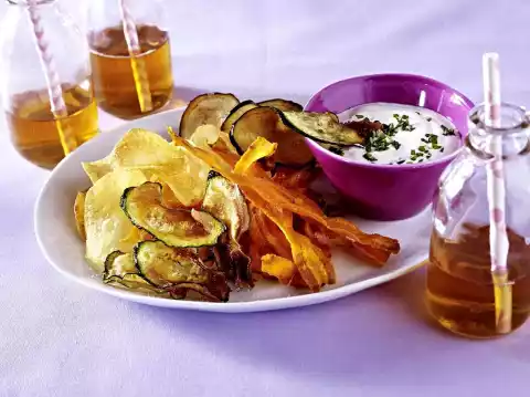Season the chips with salt and some paprika. Wash the herbs, shake dry and chop the leaves finely. Halve the lemon and squeeze the juice from one half. Mix yoghurt and sour cream, season with salt, pepper, some sugar and lemon juice. Stir in the herbs at the end. Serve the chips with the dip