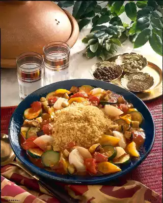Season again, keep warm. Bring 1/4 litre of salted water to the boil, remove from heat, stir in oil and couscous. Leave to swell for 3-5 minutes until all liquid has been absorbed. Place back on the stove and stir several times with a fork to make the couscous loose and granular.
