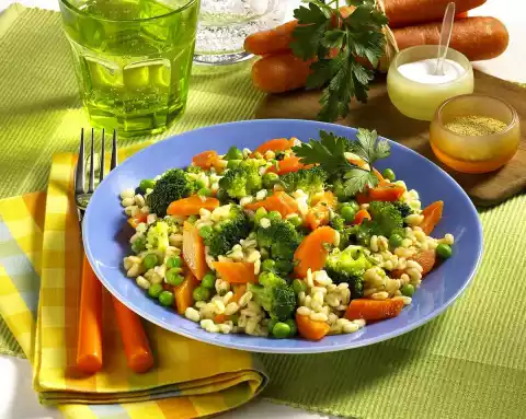 Peel and finely chop the onion. Peel, wash, halve and cut carrots into pieces. Clean, wash and cut broccoli into small florets. Heat oil in a pot. Fry onion, Ebly and carrots in it.