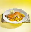 Peel and chop the onion. Wash the tomatoes, also cut into pieces. Heat lard. Fry the turkey and onion over a high heat for ten minutes while turning. Season with salt, pepper and bay leaf.