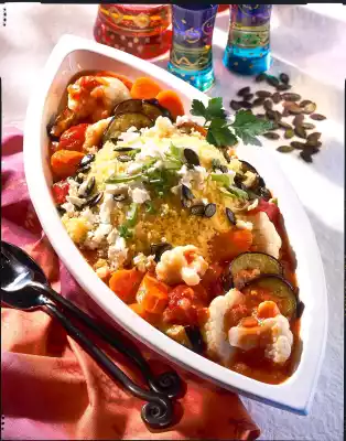 Heat olive oil in a pot and fry the eggplant slices lightly in it. Add onions and garlic, steam briefly and season with salt, cayenne pepper and cumin. Pour on 1/2 litre stock, add carrots and cauliflower and simmer covered for 5-10 minutes. Meanwhile pour tomatoes on a sieve and collect the juice. Cut the tomatoes into quarters. Add tomatoes and tomato juice to the boiling vegetables and continue cooking for about 5 minutes. Bring the remaining stock to the boil, stir in the couscous and simmer covered for 2-3 minutes. Melt 20 butter. When the couscous has absorbed all the liquid, loosen with a fork and mix in the liquid butter. Roast the pumpkin seeds in a pan without fat and finally add the remaining butter. Remove from the pan immediately. Season vegetable goulash with salt and cayenne pepper and put it in a deep dish.