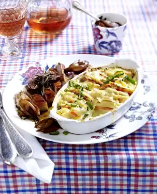 Finally, I prepare the vegetable gratin with the chops and shallots. Garnish with spring onions and rosemary.