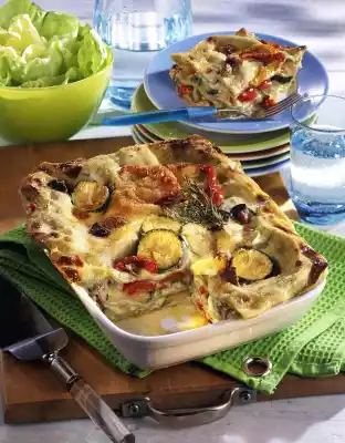 Finish with béchamel and vegetables and garnish with herbs. Grate the parmesan finely and mix with breadcrumbs. Sprinkle the lasagne with it and bake in a preheated oven (electric: 175 °C/ gas: level 2) for 45-50 minutes on the 2nd rung of the oven.