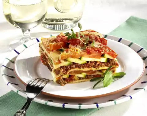 Layer half of the tomatoes and zucchini slices. Sprinkle the vegetable layers with a little salt. Add the rest of the lasagne sheets, chopped sauce, zucchini and tomato slices. Sprinkle with cheese and bake in the preheated oven (electric cooker: 200 °C/ convection oven: 175 °C/ gas: level 3) for 35-40 minutes.