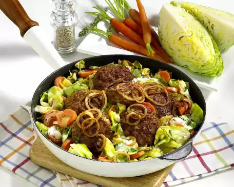 1 onion roughly dice. Heat 1 tablespoon of oil in a 2nd frying pan. Brown carrots, cabbage and onion in it. Add stock, bring to the boil and simmer for 5 minutes. Cut remaining onion into rings.