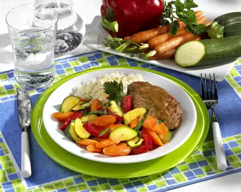 Drain the rice. Remove the meatballs from the pan. Pour off the vegetables and pour the vegetable stock into the pan. Bring to the boil and thicken with sauce thickener. Arrange meatballs, rice and vegetables on plates.