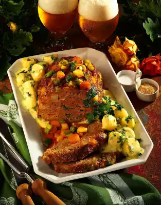 Add stock and milk while stirring, bring to the boil and simmer for about 5 minutes. Season béchamel sauce with salt, pepper and nutmeg. Wash parsley, dab dry and chop finely, except for a little bit for garnishing. Add parsley to the sauce. Drain the potatoes, rinse with cold water and peel. Depending on the size, cut the potatoes in half or leave them whole and also add them to the hot sauce. Leave meatloaf to rest for 5-10 minutes, then cut open and arrange on a plate with the vegetables and béchamel potatoes that have been braised with the meatloaf. Serve garnished with parsley