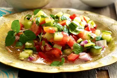 Wash the tomatoes and cucumber. Peel the onion. Clean and wash the peppers. Cut the vegetables into pieces of about 1 cm. Clean the chillies, halve them lengthwise, remove seeds, wash and chop finely. Peel garlic and chop finely.