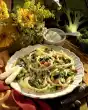 Cook the pasta in boiling salted water for about 8 minutes. Drain, drain well and mix with 1 tablespoon of oil. Clean and wash the sugar snap peas and cut them diagonally into pieces. Clean, wash and cut the peppers into bite-sized pieces. Peel garlic and onion and chop finely. Wash pork, dab dry and cut into strips.