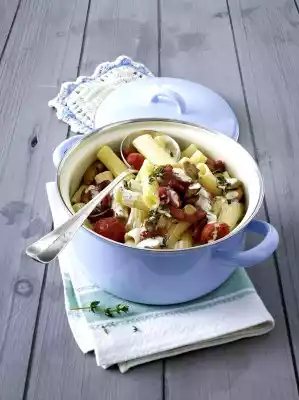 Clean, wash and halve the mushrooms or cut them into thick slices. Wash and halve tomatoes. Wash thyme, shake dry and chop the leaves coarsely. Prepare pasta in boiling salted water according to package instructions.
