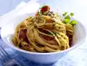 Stir in cream cheese and 1/2 of the thyme and season with salt and pepper. Let the sauce simmer for about 2 minutes. Drain the pasta. Add vegetables and bacon to the sauce and pour over the noodles. Sprinkle with remaining thyme.