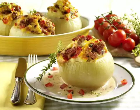 Fill the onions with the meat and potato mixture and put them into an ovenproof dish. Grill the onions under the grill of the oven for 5-10 minutes until golden brown. Meanwhile melt the fat, dust with flour and sauté for about 2 minutes.