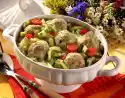 Deglaze with cream and stock, bring to the boil. Melt cheese in it, add remaining tomato cubes and chopped thyme, boil down briefly to a creamy sauce and season with salt and pepper. Remove the onions from the oven and garnish with the rest of the thyme.