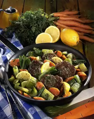 Remove, wrap in aluminium foil and keep warm. Sauté the carrots, spring onions and celery in the frying oil for about 5 minutes. Season with salt and pepper. Season meat with salt and pepper and arrange on vegetables. Spread herb butter on the meat and cover and let it melt. Garnish vegetable pan with lemon wedges