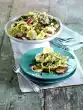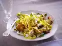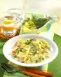 Cook the pasta in boiling salted water for about 10 minutes until it is firm to the bite. Heat the oil. Fry garlic and onions until golden brown. Add prepared vegetables and peas. Fry everything else for about 5 minutes.
