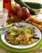 Layer the vegetables on the dough. Pour egg milk over the vegetables and sprinkle pine nuts over them. Bake the vegetable cake in the preheated oven (electric cooker: 175 °C/ gas: level 2) for about 45 minutes. Take them out and let them cool down a little.