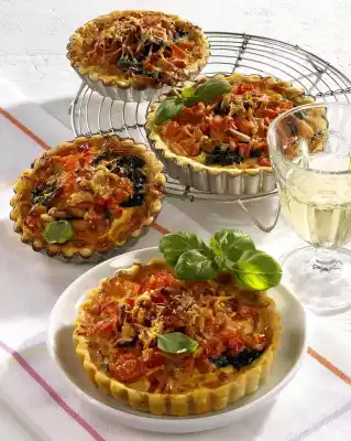 Wash and pluck the basil and garnish the tartlets with it.