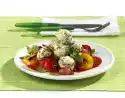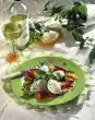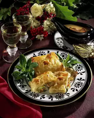 Roll out the puff pastry sheets a little bit at a time. Cut a 4 cm wide strip at the narrow end of each sheet and cut out small stars to decorate. Place a heaped tablespoon of the vegetable-cheese mixture on each half of the plate.