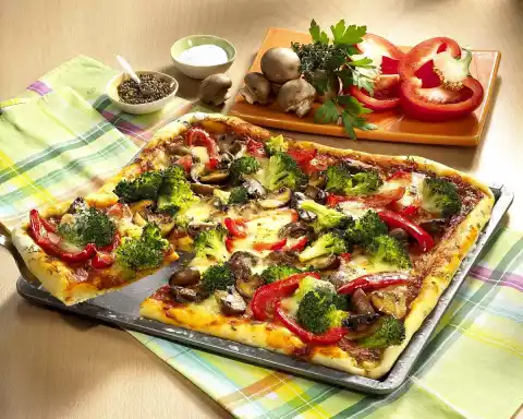 Grease a baking tray (approx. 30 x 35 cm), dust with flour and roll out the yeast dough on top. Spread tomato sauce on it and cover with the vegetables. Add the mozzarella cheese. Place the tray on a grid and bake on the lower level in the preheated oven (electric range: 200 °C/ convection oven: 175 °C/ gas: level 3) for 20-25 minutes. Take out and serve immediately