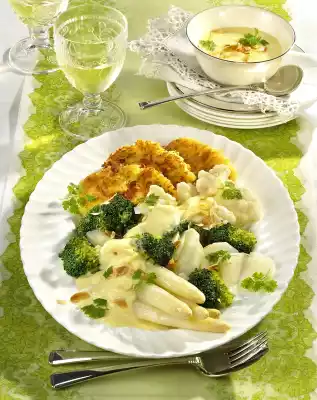 Peel and wash the potatoes and cook them in salted water for about 20 minutes. Roast almonds in a pan without fat until golden brown. Take them out. Peel and wash the asparagus and cut off the woody ends. Clean, peel, wash and slice the kohlrabi. Clean and wash the cauliflower and broccoli and cut into florets. Cook the asparagus in boiling, slightly salted water with sugar for 15-20 minutes.