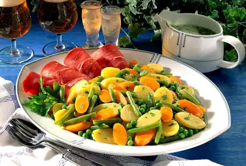 Drain the potatoes, peel and slice them. Mix vegetables and potatoes carefully and arrange on a plate with the ham. Sprinkle with parsley and garnish. Add sauce extra.