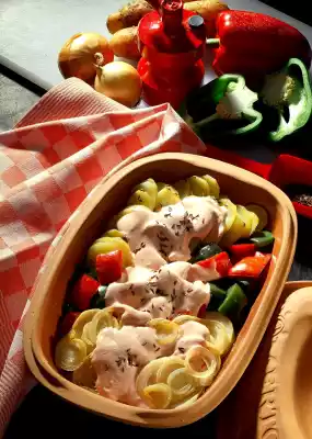 Water the refractory clay pot for about 10 minutes. Peel and slice onions and potatoes. Clean, wash and cut the peppers into pieces. Layer prepared vegetables in the clay pot.