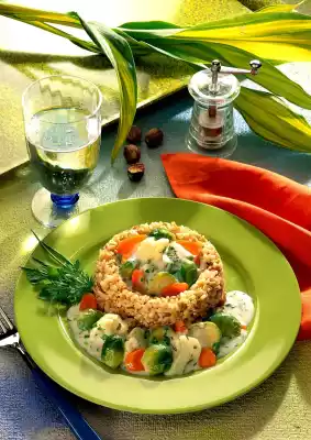 Season to taste with salt, pepper and nutmeg. Wash the herbs (put something aside for garnishing), chop finely and stir in. Add vegetables to the sauce. Drain the rice mixture. Pour into small savarin cups as desired and turn out onto plates.