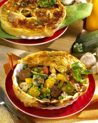 Roll out each panel to a square (approx. 16x16 cm) on a floured work surface. Cut a small hole in the middle of each plate. Distribute the vegetables with meatballs in the moulds. Place one puff pastry sheet on each and press the edge firmly.