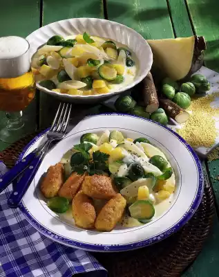 Heat 2 tablespoons of oil in a saucepan and sauté the remaining onions. Add turnips and steam for about 5 minutes. Season with salt and pepper. Deglaze with remaining stock. Add Brussels sprouts and cook the vegetables for about 20 minutes.