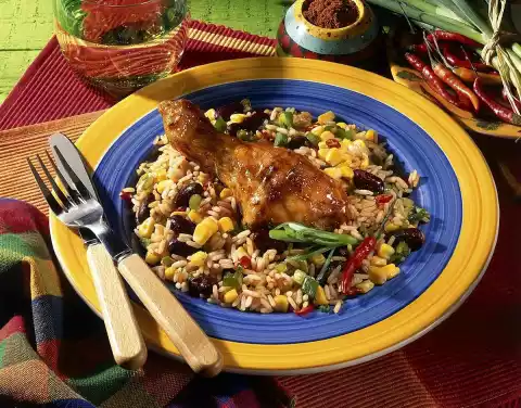 Clean, wash and chop the spring onions. Add the corn and kidney beans to the rice about 5 minutes before the end of the cooking time. Stir in tomato paste and season to taste