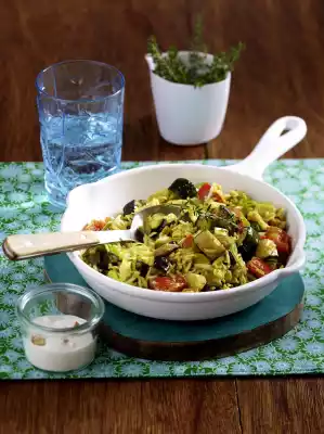 Heat 1 tablespoon of oil in a large frying pan. Sauté the aubergine, zucchini and peppers for 3-4 minutes. Dust with curry. Add thyme and pour on coconut milk. Cover and simmer for 8-10 minutes. Add rice, 3 tbsp. water and spring onions 3 minutes before the end of cooking time. Season to taste with salt and pepper