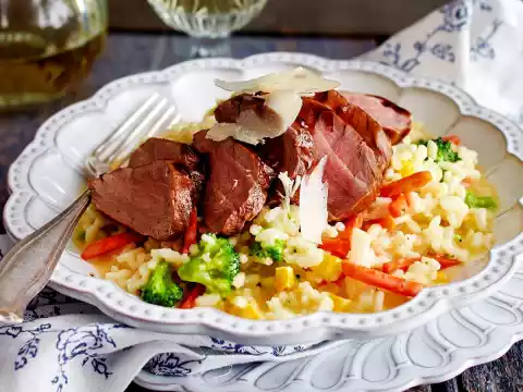 Remove meat from the oven, let it rest for a short time, cut into thin slices and sprinkle with remaining cream. Arrange risotto and meat on plates sprinkled with Parmesan shavings.
