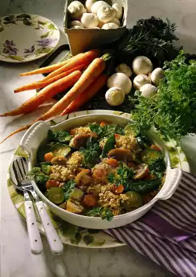 Wash the millet, sauté briefly and top up with the stock. Cook for 20 minutes at medium heat. In the meantime, pluck the chervil leaves from the stalks. Fold the pre-cooked vegetables and chervil into the millet.