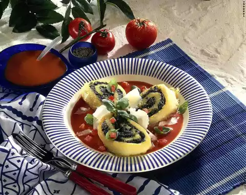 Tomato sauce tastes good with it. Serve sprinkled with sliced parmesan and basil leaves and garnished.