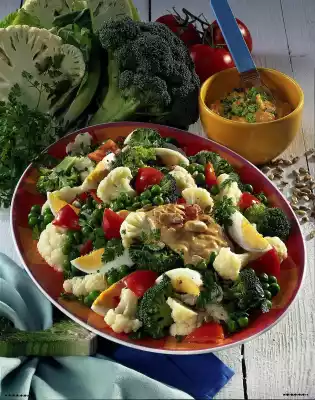 Mix the prepared salad ingredients. Arrange with some peanut sauce and serve the rest separately